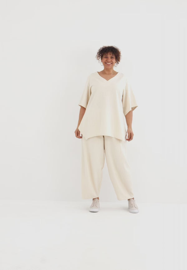 Ob als harmonisches Set mit Tunika oder Jacke aus der Linaya Kollektion oder ganz individuell mit schlichten Basics kombiniert – diese Hose steht für entspannte Eleganz, natürliche Materialien und zeitlose Vielseitigkeit.