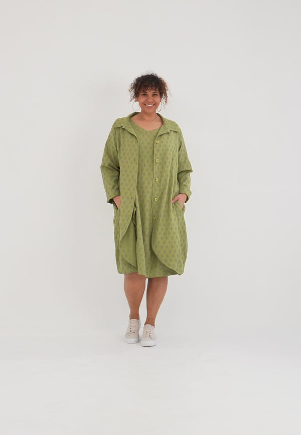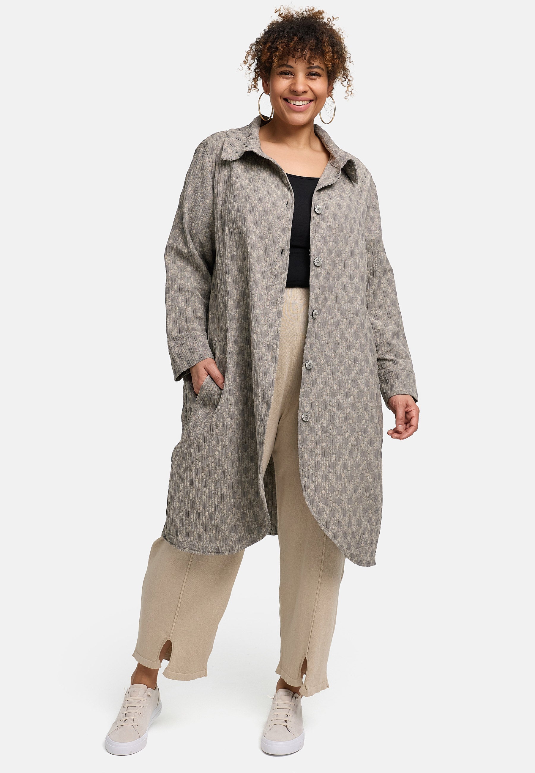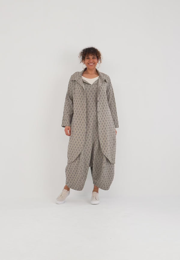 „Olina“ ist dein unkomplizierter Begleiter zwischen Büro, Stadtbummel und Wochenend-Trip. Der strukturiert gewebte Jacquard verleiht Tiefe und eine edle Haptik, während die lockere Weite layering-tauglich bleibt. Der smarte Hemdkragen und die durchgehende Knopfleiste spielen den Mantel mal elegant, mal sportiv; der runde Tulpen-Saum vorn und der bewegliche Rückenschlitz setzen moderne Akzente und geben dir bei jedem Schritt Freiheit.
