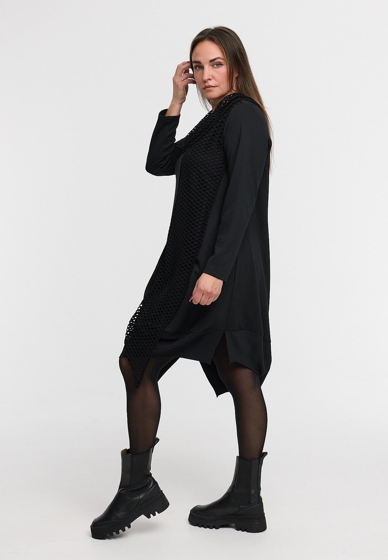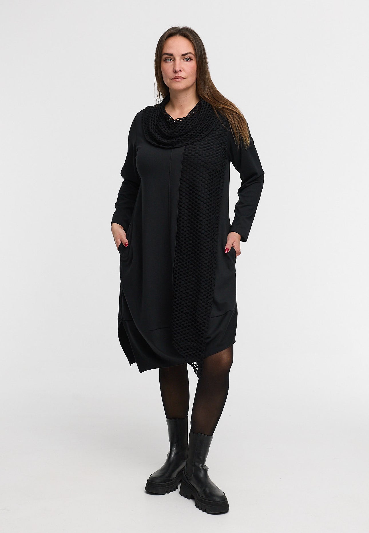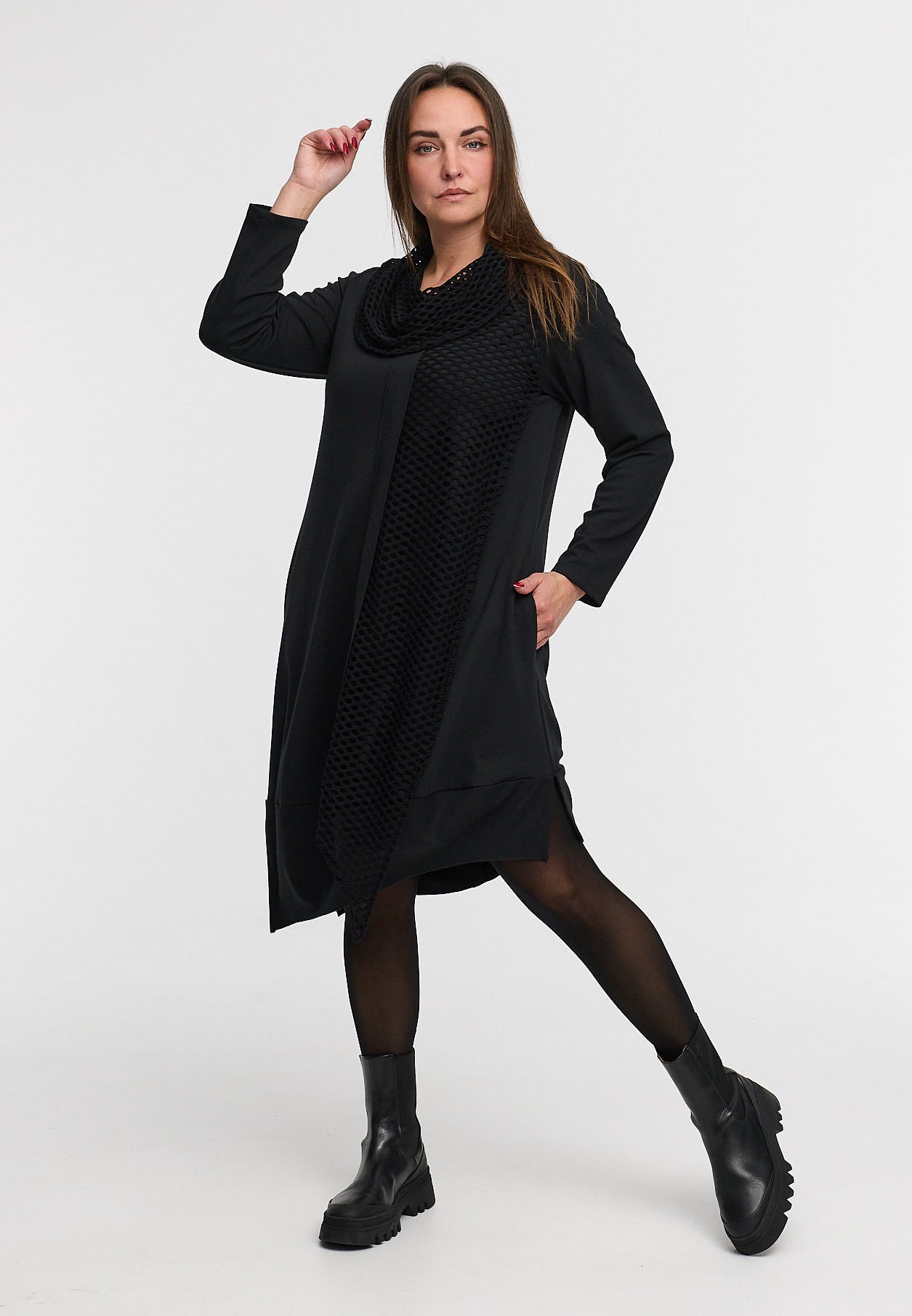 „Lunet“ steht für moderne Eleganz mit künstlerischem Anspruch. Das Kleid kombiniert zwei Materialien zu einem spannenden, monochromen Spiel aus Struktur und Bewegung. Der weich fallende Stoff sorgt für Komfort, während der raffinierte Netz-Einsatz vorn und am Kragen einen modischen Blickfang schafft.