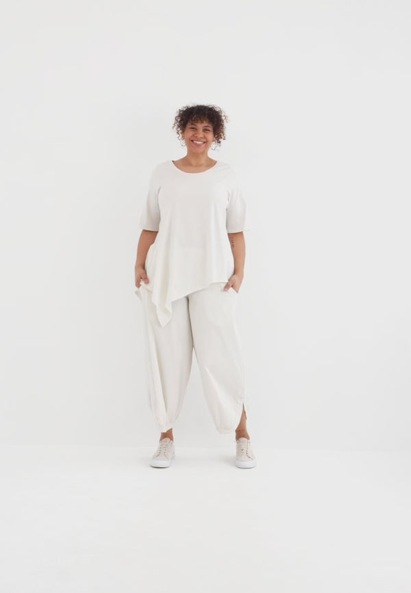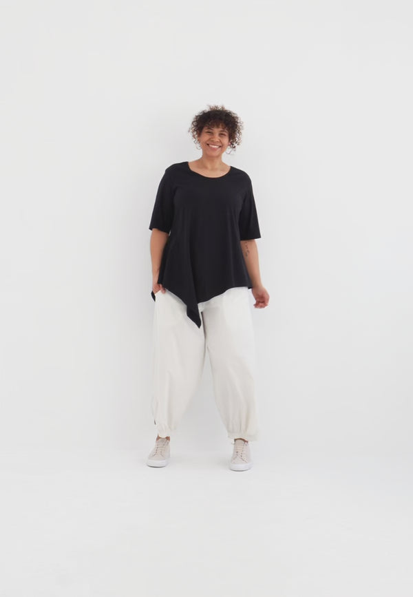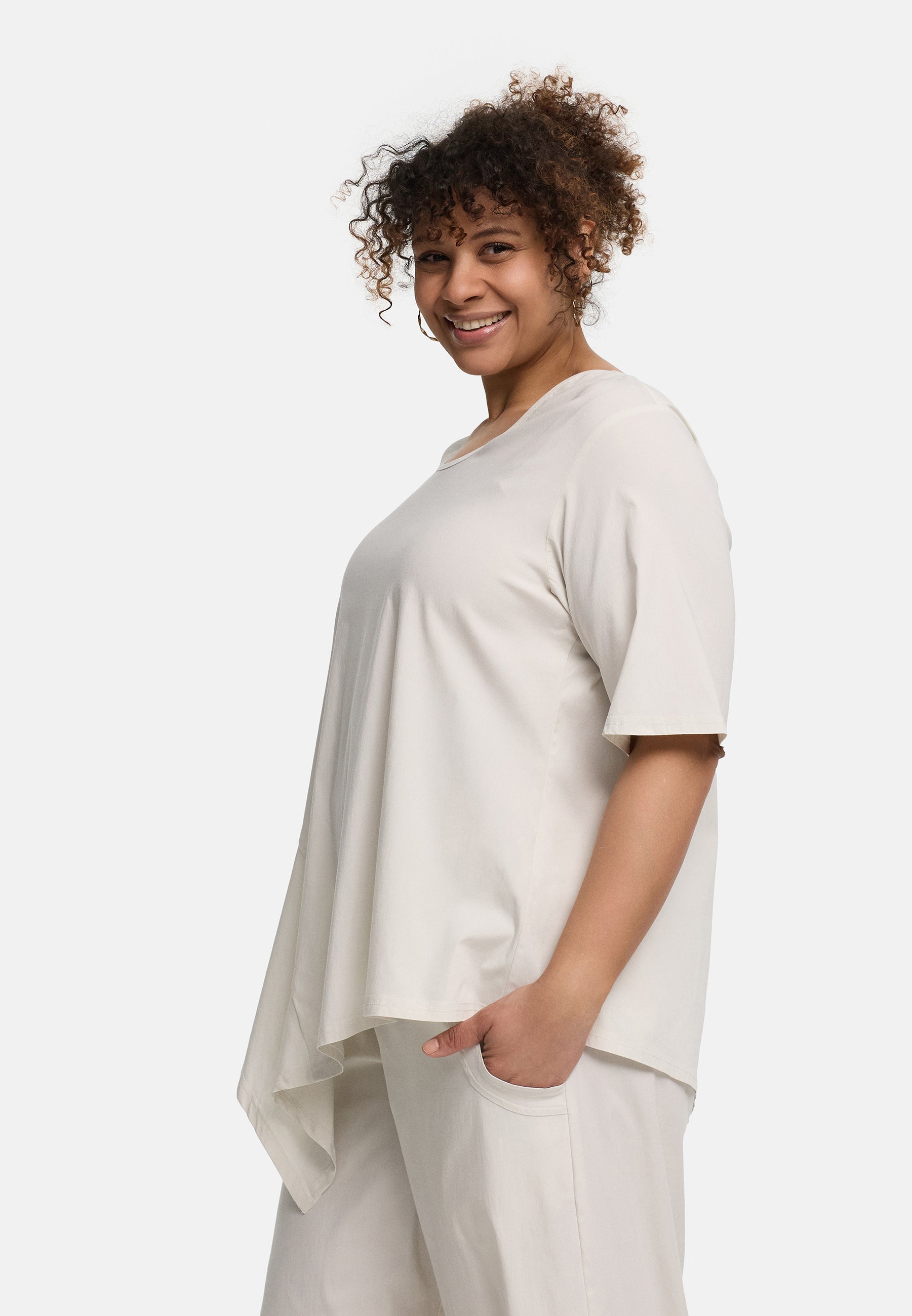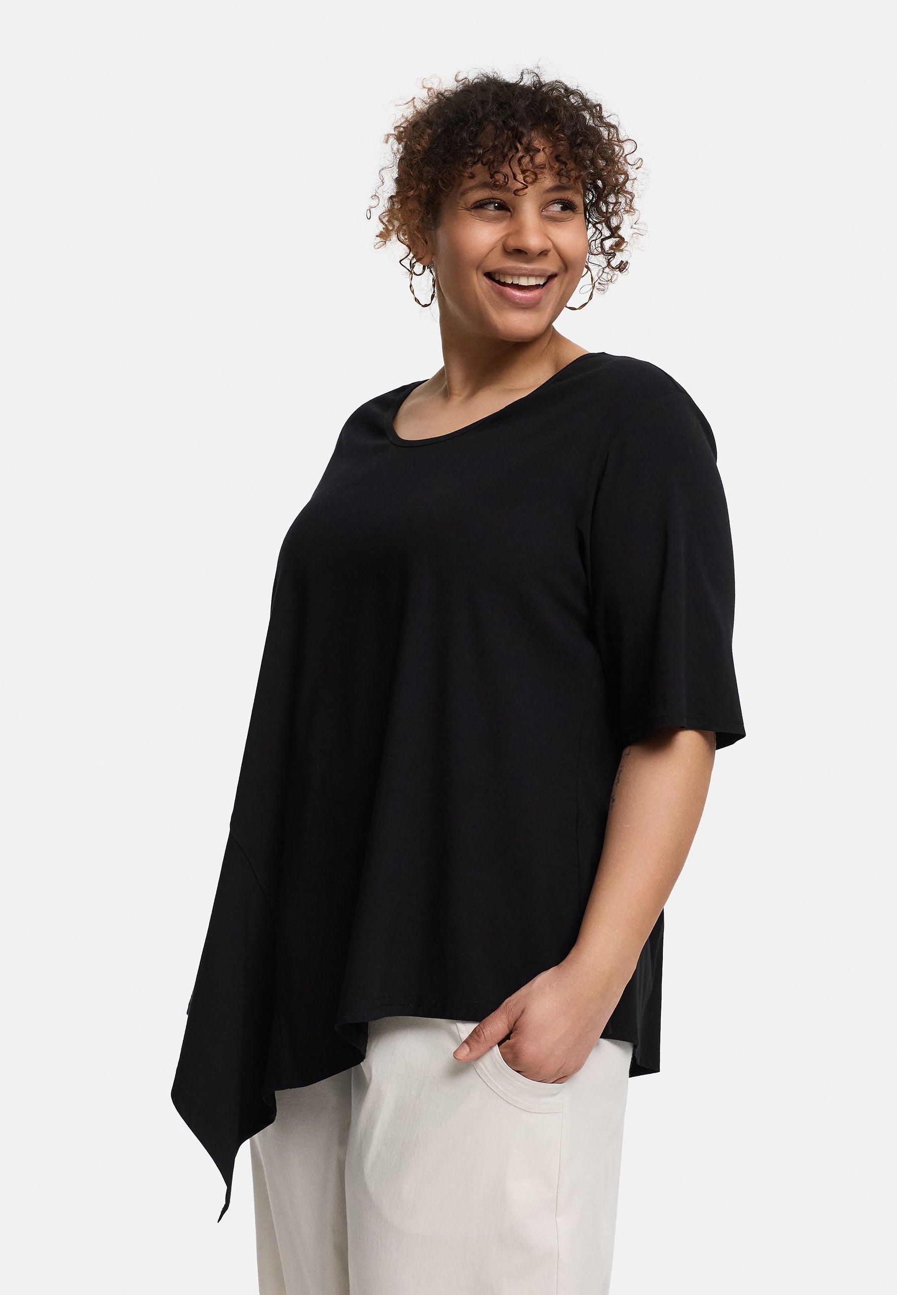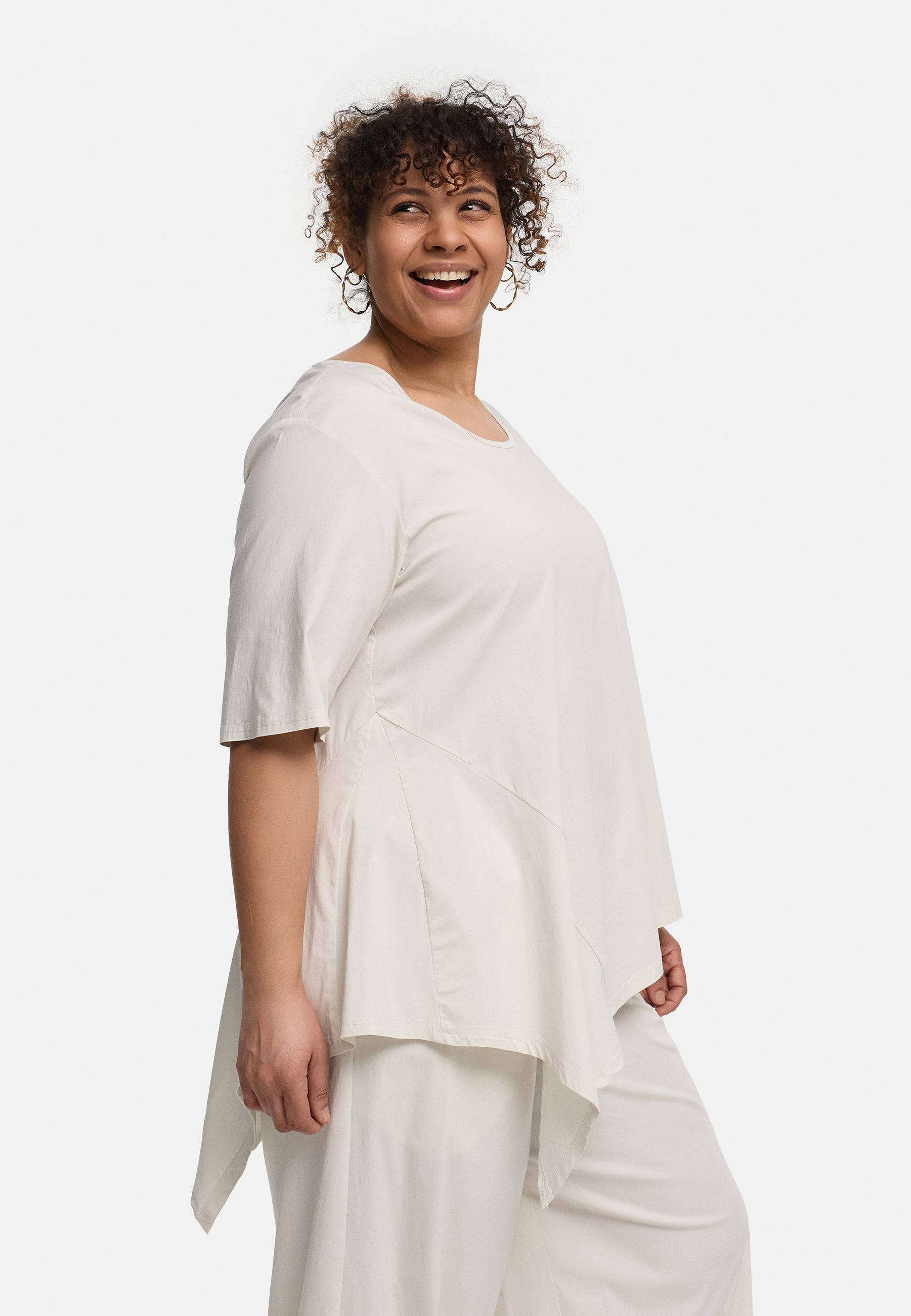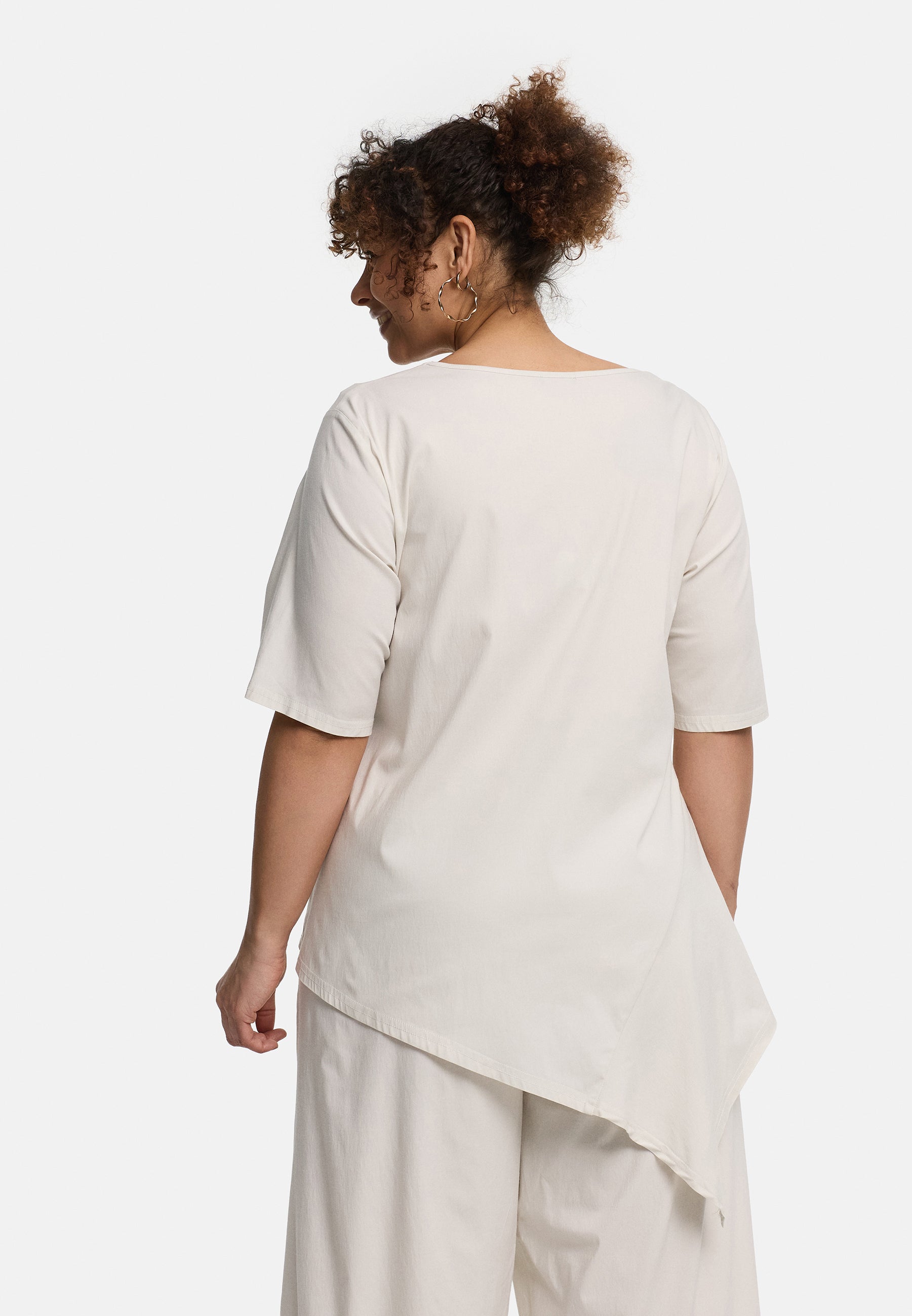 Der cleane Rundhalsausschnitt und die halblangen Ärmel bringen Ruhe in das Design und lassen die besondere Schnittführung umso schöner zur Geltung kommen. So entsteht ein Look, der entspannt wirkt und gleichzeitig modische Präsenz hat. In hellem Creme wirkt die Tunika weich, natürlich und ruhig, in Schwarz dagegen klar, edel und ausdrucksstark. „Valeria“ ist damit ein vielseitiges Lieblingsstück für alle, die Komfort mit einem besonderen Schnitt verbinden möchten.