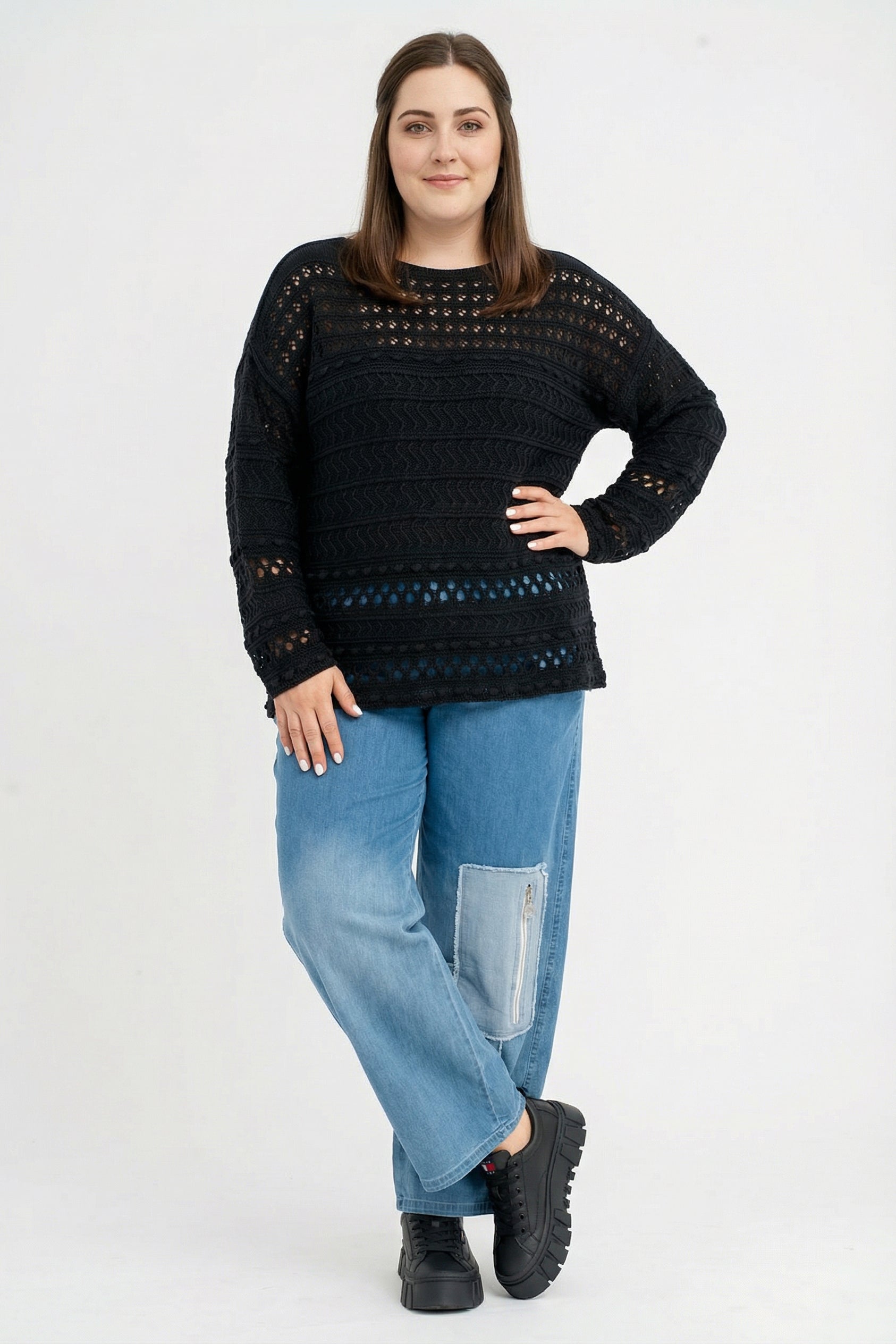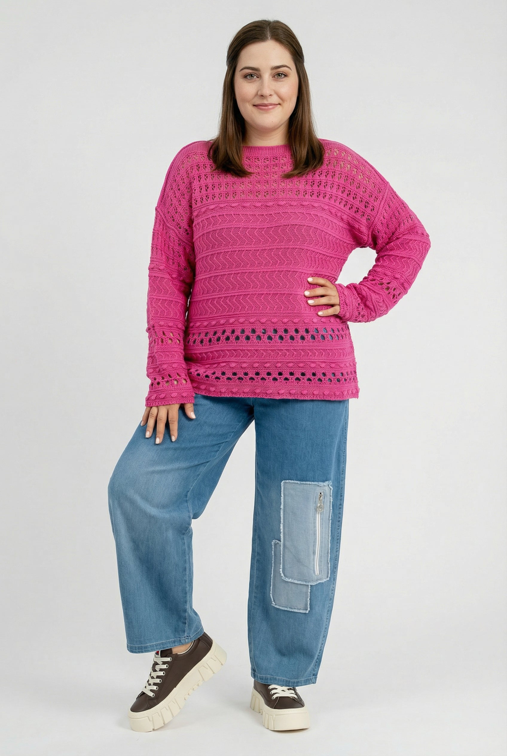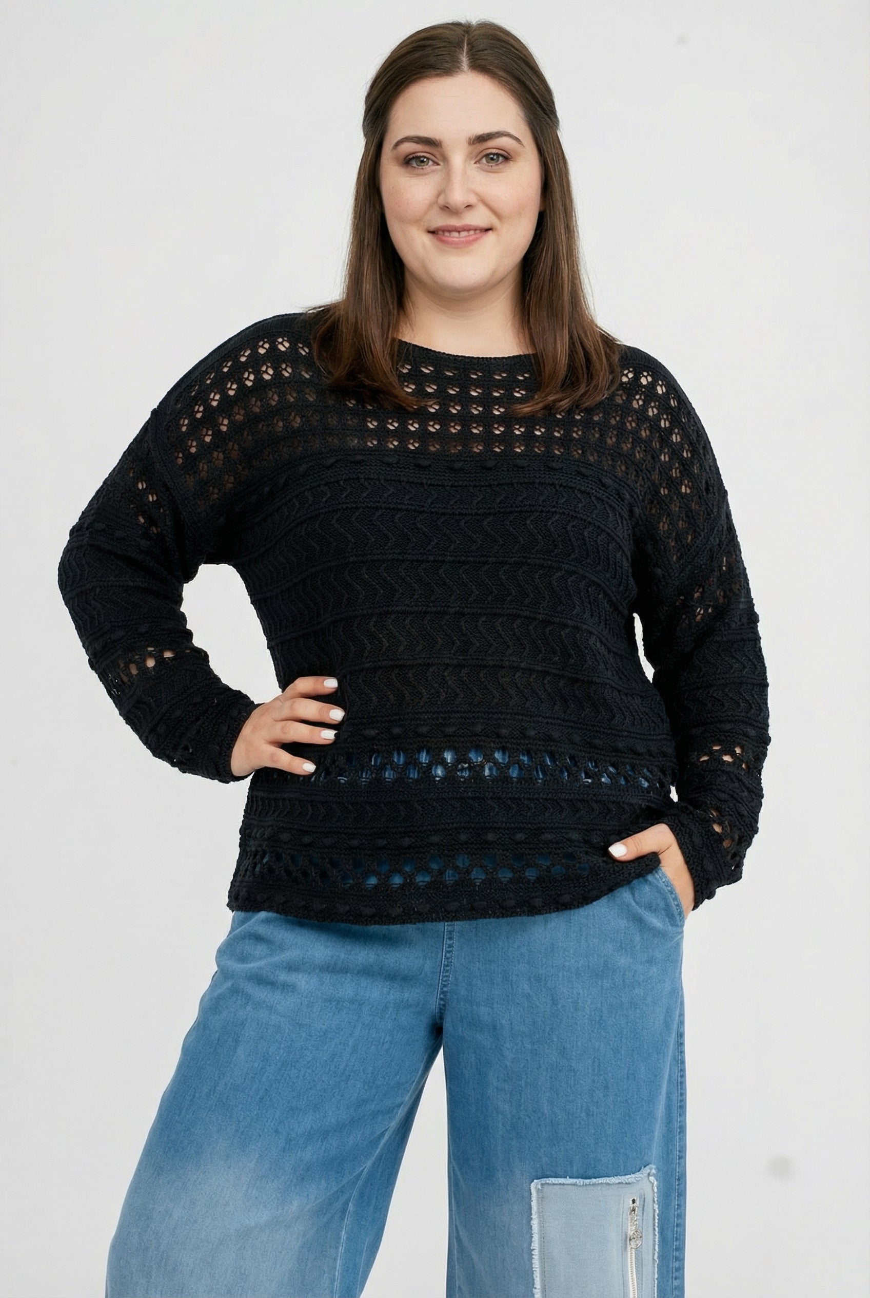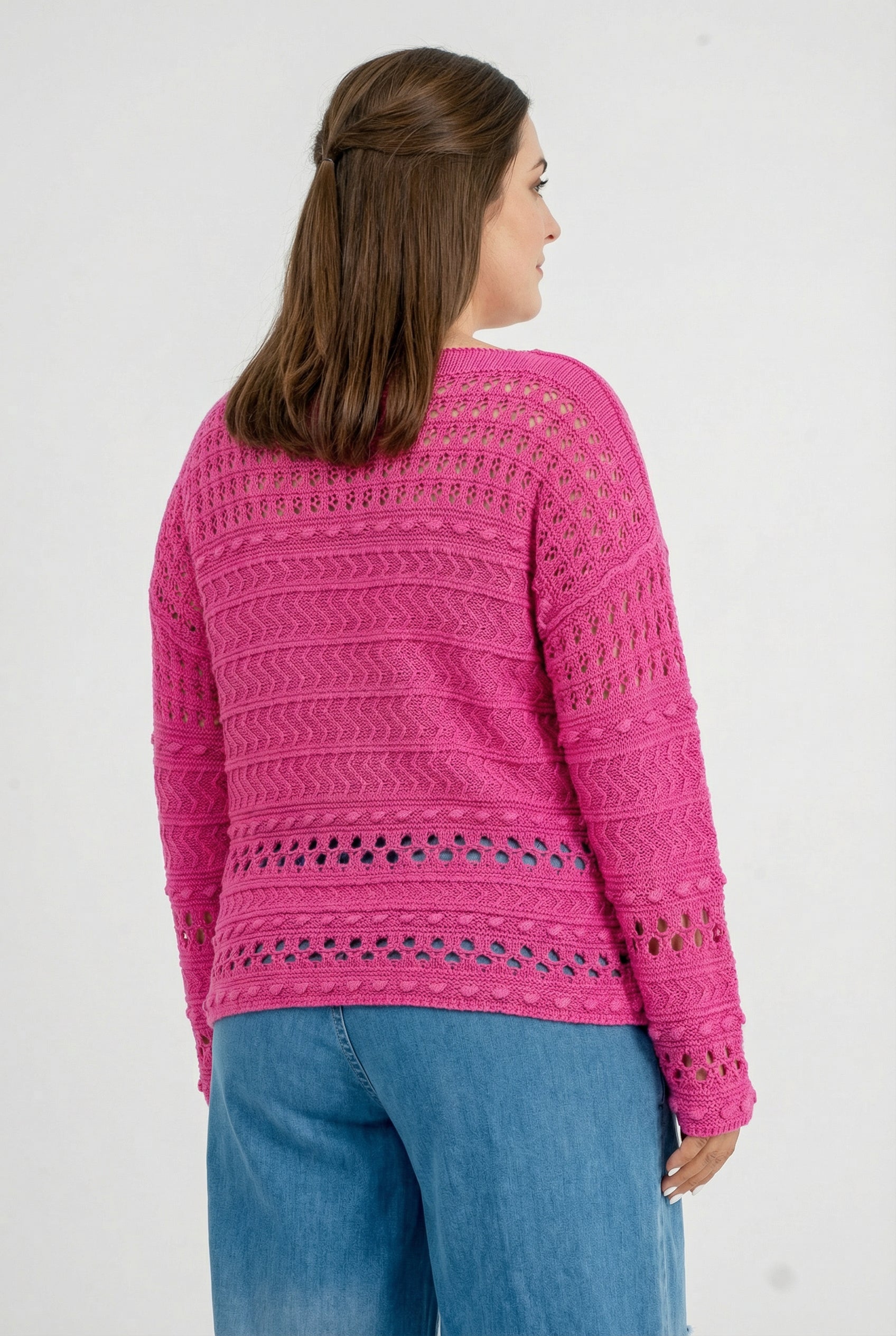 Der feine Baumwollstrick kombiniert grafische Ajourreihen mit sanften Zopfstrukturen und erzeugt einen spannenden, aber ruhigen Look. Dank des entspannten Schnitts fällt das Shirt locker über Hüfte und Bauch, ohne an Volumen zuzulegen. Schwarz wirkt clean und citytauglich, Beige natürlich und soft, Pink sorgt für ein frisches Statement. Durch die leichte Transparenz eignet es sich ideal zum Layern.